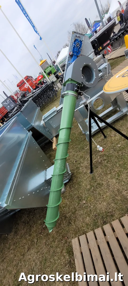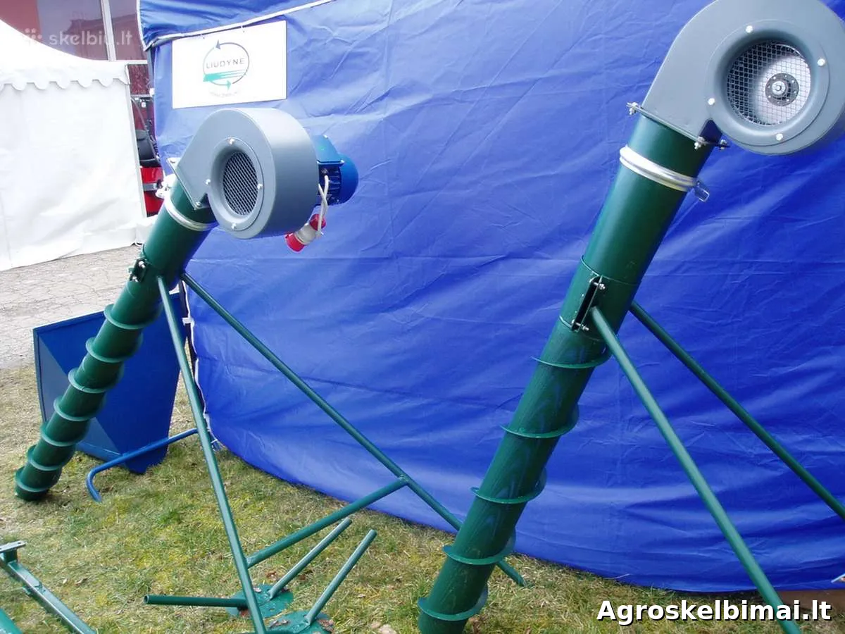 Aprašymas: Bendras ilgis-1,9 - 2,50m. Paduodamas oro kiekis 2200 m3/val. Masė 20kg. El.var.1,1 - 1,5kw. Trifaziai arba vienfaziai. Traukia arba pučia orą. Grūdų vėdinimas reikalingas norint atvėsinti supiltus grūdus, sumažinti jų drėgnumą, palaikyti optimalią temperatūrą, užkirsti kelią kaitimui. Suteikiama garantija. Gaminiai sertifikuoti. Aprašymas: Aeratorius susideda iš pagrindinių surinkimo mazgų: 1) aeracijos vamzdžio 2) išcentrinio ventiliatoriaus 3) elektros variklio; Aeratoriaus veikimo principas. Grūdų masė prapučiama oro srautu per aeracijos vamzdį. Norint sukurti srautą, sumontuotas išcentrinis ventiliatorius. Sumontuokite aeratorių į grūdų krūvą, įsukdami aeracijos vamzdį į grūdų masės sluoksnį. Grūdų krūva vėdinama pučiant orą. Aeratorius skirtas: - išdžiovinti ir vėdinti grūdų saugyklą; - pašalina savaiminio įšilimo kišenes; - mažina kenkėjų aktyvumą; - sumažina grūdų temperatūrą krūvoje; - užtikrins oro srautą į tarpgrūdinę erdvę brandinimo po derliaus nuėmimo metu; - pašalins pelėsių atsiradimą ir grybų bei kitų kenkėjų dauginimąsi; - taupo vietą, kuri kitu atveju būtų naudojama grūdams pervežti saugyklos viduje; - sumažina darbo sąnaudas ir žaliavų nuostolius persikėlus į kitą vietą.