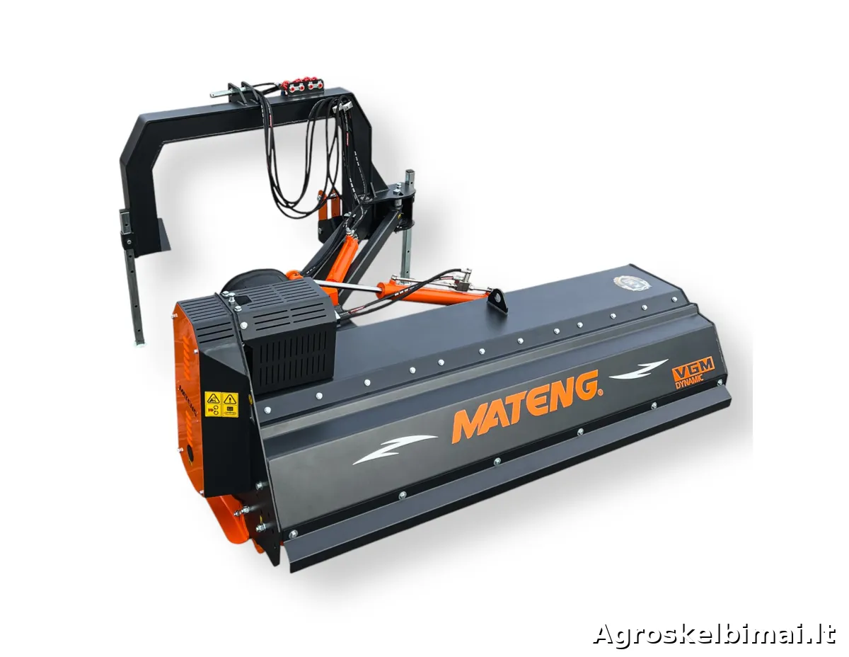 MATENG VGM DYNAMIC160 - tvirta, sunkios serijos, šlaitinė žoliapjovė (mulčeris). Ši žoliapjovė skirta profesionaliam naudojimui, pjauti - mulčuoti aukštą ir netvarkingą žolę, bei smulkias šakas šlaituose, pakelėse, vandens telkinių pakrantėse, nelygiuose paviršiuose. VGM DYNAMIC160 tinka traktoriams nuo 80 AG (arklio galių). Žoliapjovė kabinama traktoriaus gale prie trijų taškų prikabinimo sistemos, varoma 540 aps./min greičiu nuo darbinio veleno (PTO) sujungtu kardanu. Reduktorius perduoda sukimą per 4 trapecinius diržus į pjovimo veleną ant kurio sumontuoti pjovimo plaktukai. Peilių veleno guoliai su guoliavietemis patogiai ir lengvai aptranaujami ir reikalui esant keičiami. VGM DYNAMIC160 žoliapjovė komplektuojama su tvirtais ir sunkiais “T” formos plaktukais, kurio vieno svoris 1,370 Kg! Pjovimo aukštis reguliuojamas atraminio volo ir šoninių atraminių slidžių pagalba. Atraminis volas turi dvi veikimo pozicijas: nupjauta žolė metama už volo arba nupjauta žolė metama prieš volą (suspaudžiama). VGM DYNAMIC modeliuose atraminio volo guoliai sumontuoti jo viduje, kas prailgina jų tarnavimo laiką. Hidraulinės alkūnės pagalba, žoliapjovės padetį galima keisti tam tikromis kryptimis - horizontaliai ir vertikaliai pjaunamam paviršiui (pajungimui reikalingos keturios hidraulinės jungtys traktoriaus gale). Pakreipimo kampas žemyn yra iki 50°, į viršų iki 90°.
