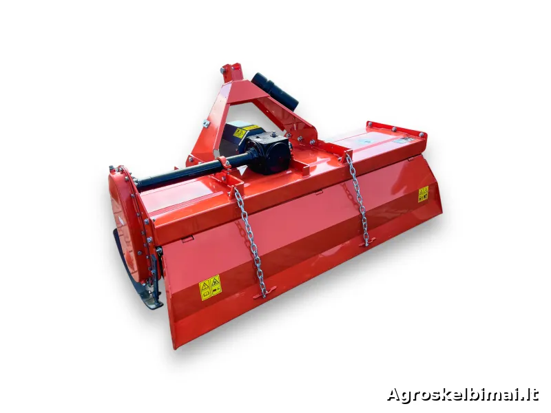 MATENG LG135 žemės dirbimo freza parduodama kartu su kardaniniu velenu, paruošta darbui.